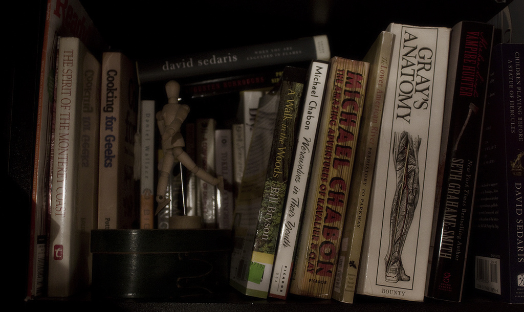 Today was one of those days where I was busy doing other things and didn’t even think about taking pictures until about 30 minutes ago. I’m not feeling very inspired, so without further ado, tonight I present to you a photo of a crowded bookshelf. And bad lighting.