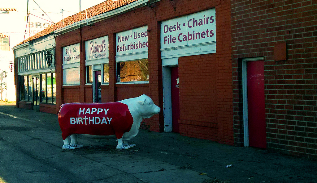 I was in Midtown today for a job orientation, and on the way out I drove by Rulands office furniture store. There is always a cow out front during business hours and it always has a message on the side of it.