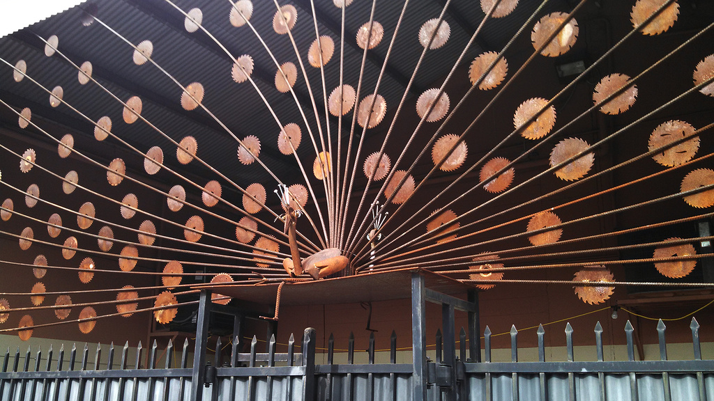 This peacock art piece stretches across the top of a gate in an alley I go through near work. I think there is a metal studio back there.