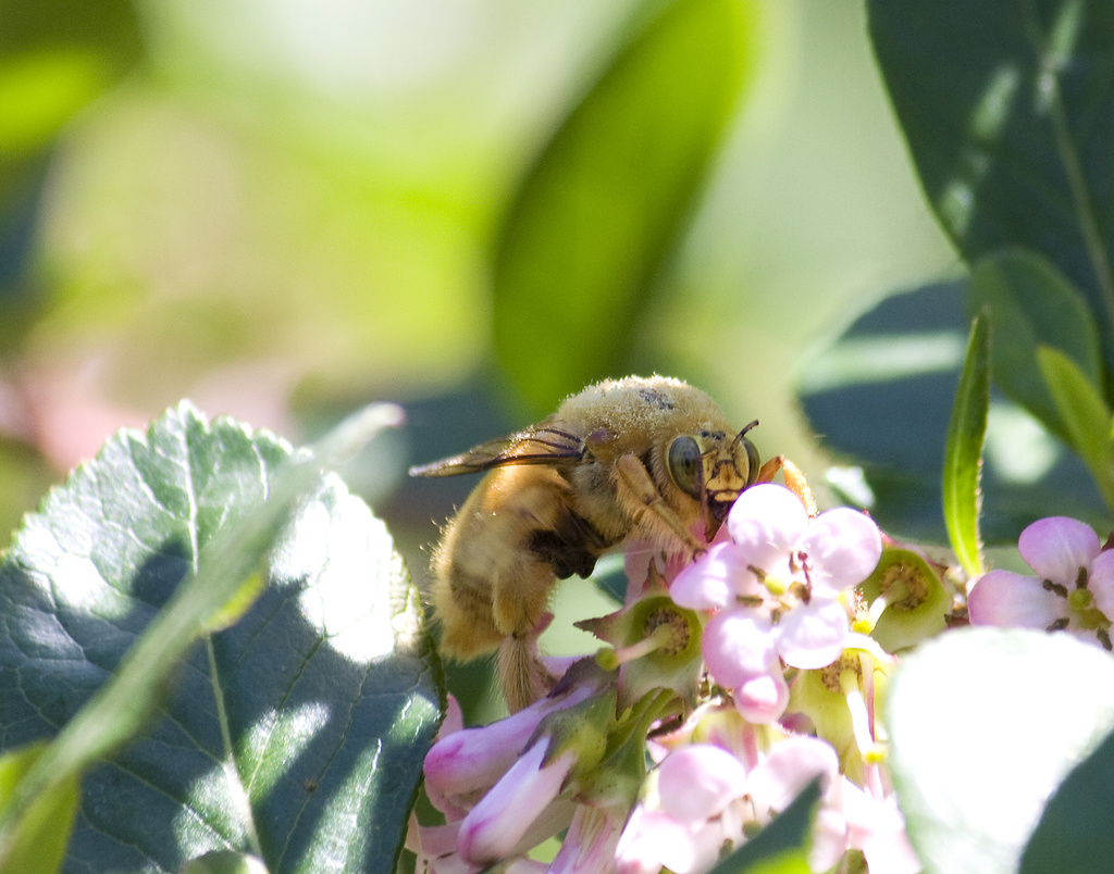 This is a male valley carpenter bee. I normally only see the all black females here, so this is a rare sighting in my yard. The valley carpenter bee is the biggest bee in California. The females can get really huge. The males are typically not as big; however, they are still fairly imposing. This one was definitely bigger than all the other bees around at the time, and he was clambering all over the escallonia like the bee version of Godzilla, knocking off petals and pollen, and shaking off the ants. The escallonia is like crack for bees, so I’m betting he’ll be back!