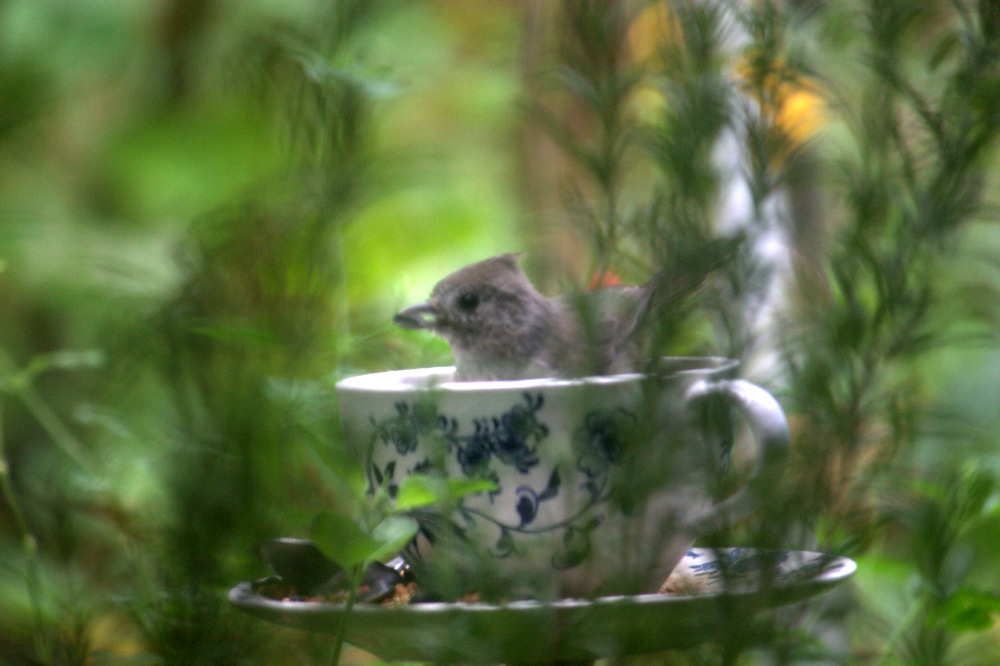 This photo is a little murky, mainly because I was shooting through an old distorted window and a big rosemary shrub (note to self: I need to prune that sucker back), so terms like “amazing clarity” and “sharp focus” will not be used to describe this image. I decided to post it anyway because when something as cute as a titmouse in a teacup happens, you just have to share.