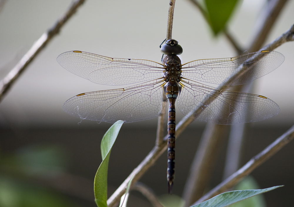 I couldn’t get a clear shot from the opposite side of the dragonfly, which is unfortunate because the sun shining through its wings made them appear as if they were spun out of golden thread. I caught myself thinking that the dragonfly looked very much like a piece of art nouveau jewelry that had been placed in the tree as I was comparing its wings to Tiffany stained glass, which is funny because this insect was the original inspiration for such works of art.