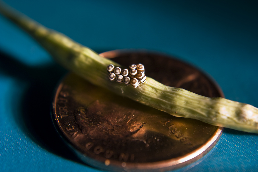 Last month I posted a photo of a harlequin beetle in my garden. Since then, several of those beetles have moved in, so I let them have a broccoli rabe plant in order to keep them out of the rest of the garden. A few days ago I noticed eggs on the plant… quite a bunch actually. I suppose I’ll have to destroy these since I don’t want the garden overrun by stink beetles, but they are so very interesting looking. They’re also quite tiny; I’ve placed them on a US penny here for size reference.