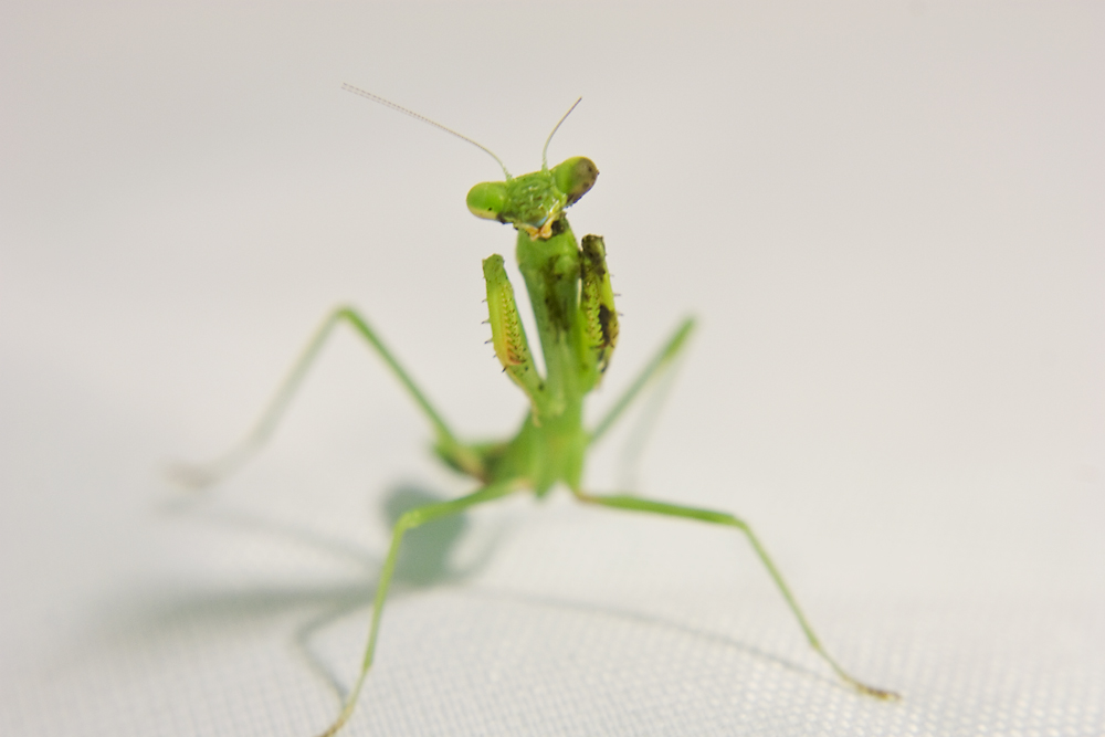 Yesterday as I was pulling some weeds in the garden, a wasp flew into the dill and attacked this little mantis. I intervened and collected the mantis from where it had fallen. It didn’t seem to be moving around normally after that, so I took it inside for the night. Today the mantis is looking quite battered and one of its arms isn’t working. I gave it a fly, which it appears to be interested in catching, but hasn’t managed to do so yet. So, apparently I’m running a praying mantis rehab center now.