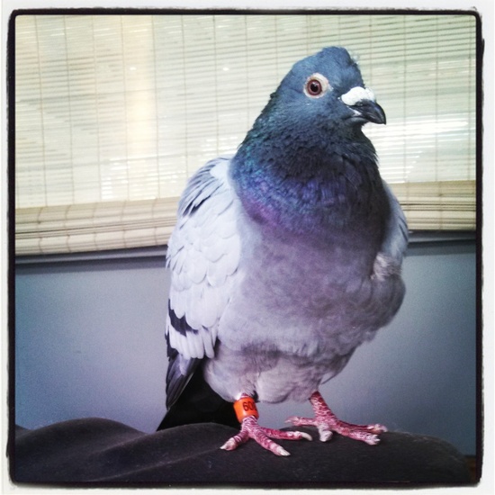 So, I’ve been adopted by a pigeon. He (she?) has decided to hang up his racing wings and just live at my place full time. He’s molting right now (apparently this is the time of year that pigeons do that here), so he is sporting what looks like little spikes all over his head.